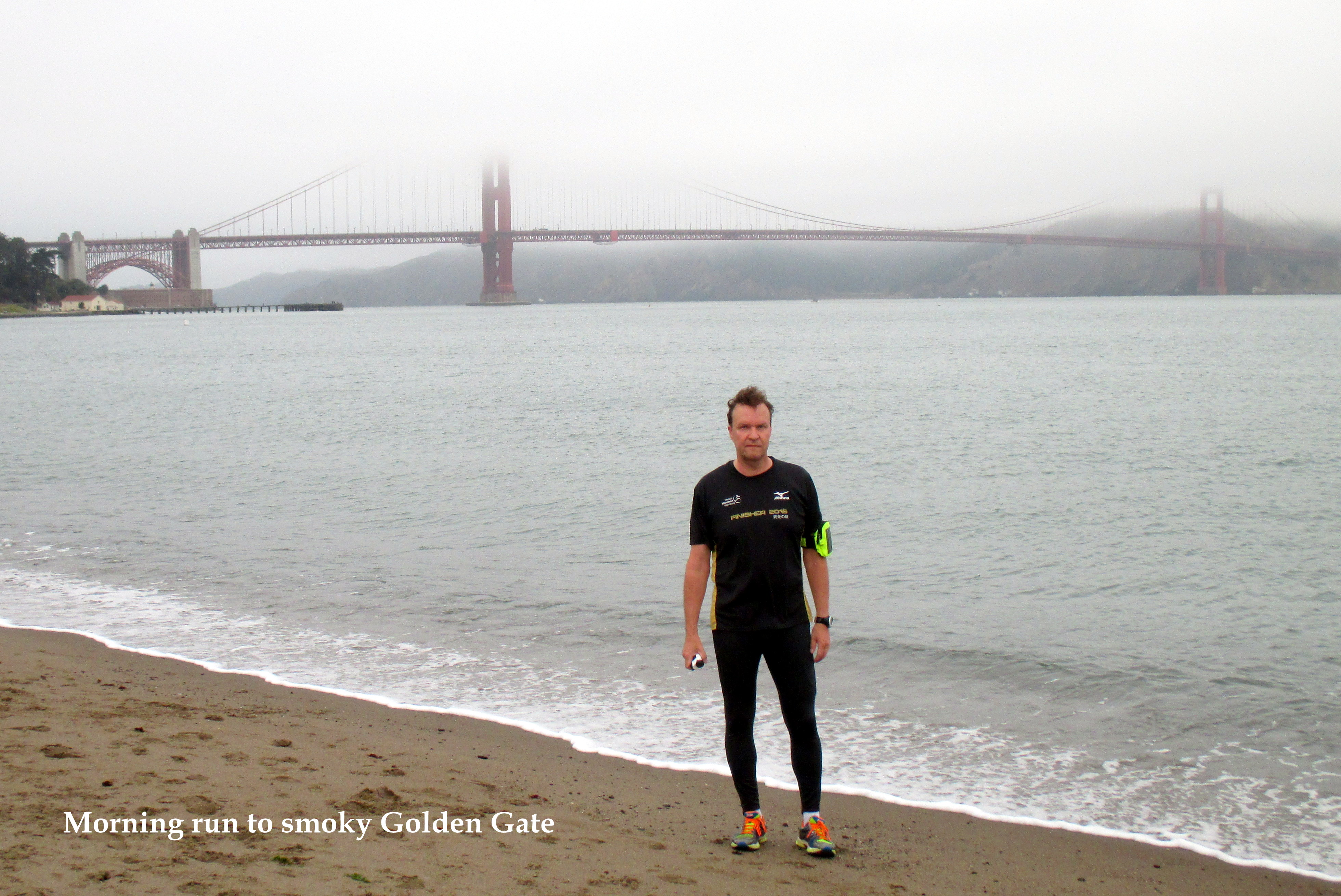After very deep of sleep in (Travelodge Wisherman’s Wharf) we went to early morning run. Almost 17 km to Golden Gate and back. Bridge was shown behind smoke carpet.