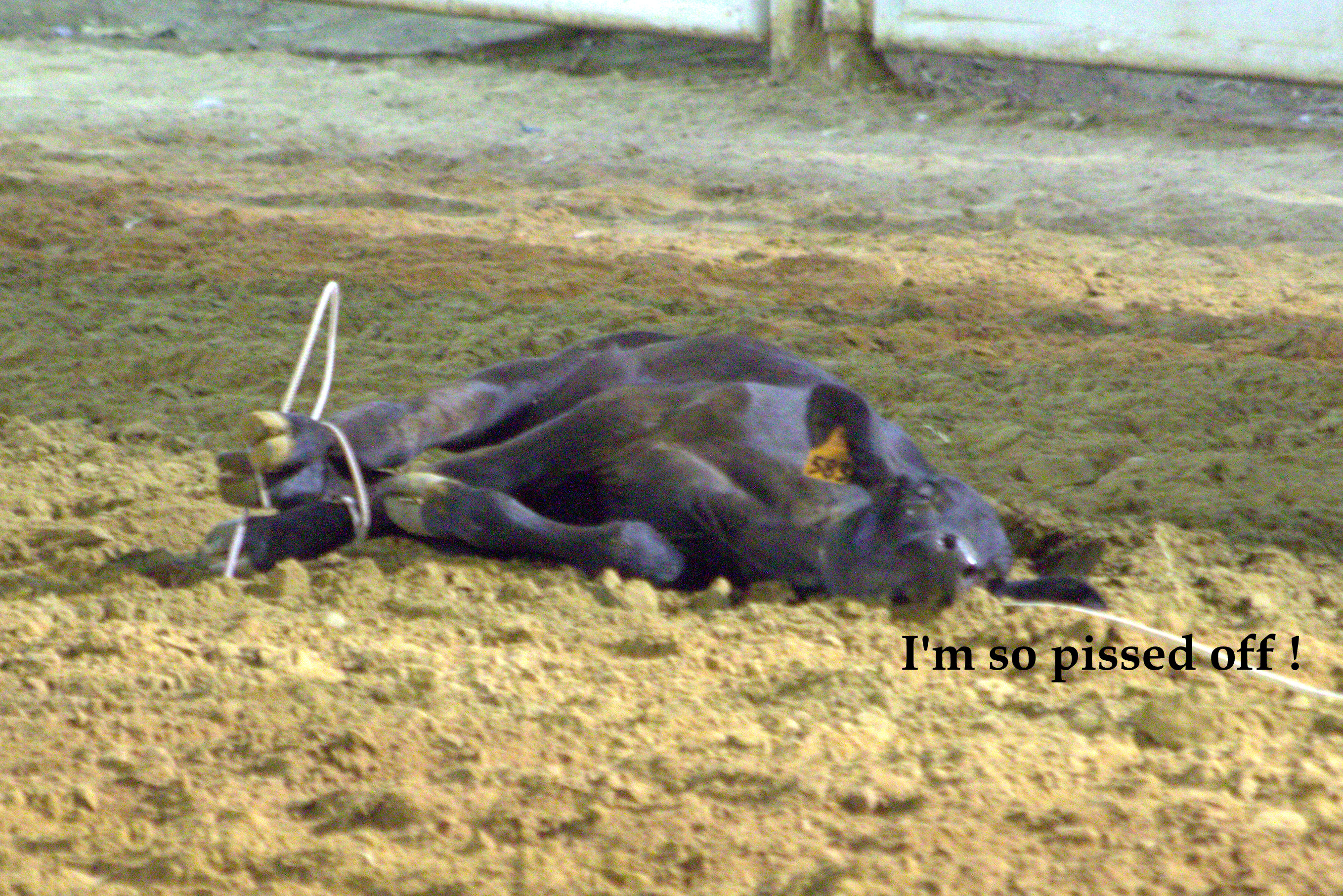 Vastaava ohjelma toistettiin myöhemmin illalla, mutta tällä kertaa naisille kohdistettuna yleisökisailuna. Kehiin oli heitetty jo jonkun verran miehekkäämmän kokoinen mullikka, jolla oli jo kunnon sarvetkin ja persuksissa taas joku lippunauha, joka pitäisi saada napattua. Voittaja löytyi tässäkin lajissa eikä ketään tullut keihästettyä, mutta vauhtia ja vaarallisia tilanteita kyllä riitti niin, että taas sai lehtereillä jännittää tosissaan.